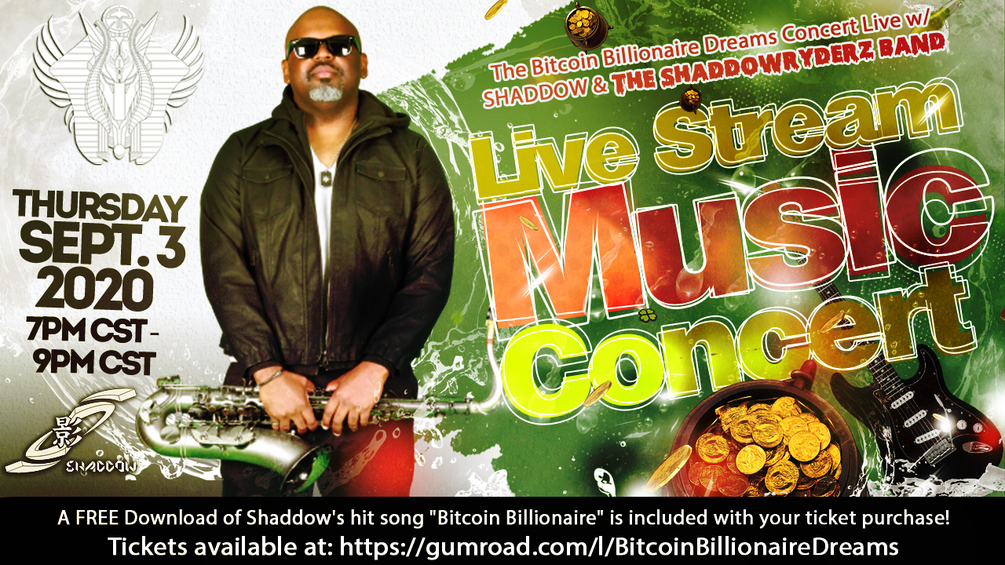 It's big news: Shaddow's #BitcoinBillionaireChallenge Tiktok Dance Contest is a big hit!! Everybody is talking about it and major press outlets around the world are covering it! Now it's time to celebrate! Join Shaddow and The Shaddowryderz Band as they perform his exciting original music live! They'd love to have your virtual company, wherever you may be! A FREE Download of Shaddow's hit song "Bitcoin Billionaire" is included with your ticket purchase!
